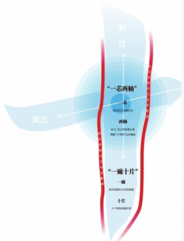 “一芯兩軸”打造“武漢長江文明之芯”,錨固長江、漢江及東西山系為依托的兩條“十字形”山水軸線。