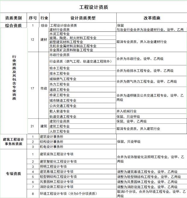 2、工程設(shè)計資質(zhì)。保留綜合資質(zhì)。對部分行業(yè)資質(zhì)進(jìn)行整合。