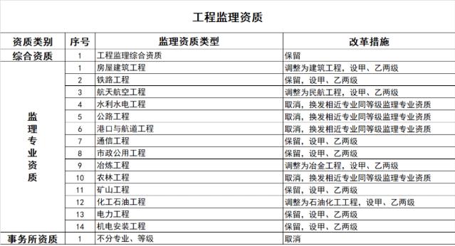 (四)工程監(jiān)理資質(zhì)。保留綜合資質(zhì)。取消水利水電工程、公路工程、港口與航道工程等專業(yè)資質(zhì),其資質(zhì)要求執(zhí)行有關(guān)行業(yè)主管部門規(guī)定。取消農(nóng)林工程監(jiān)理資質(zhì),建設(shè)單位委托農(nóng)林工程監(jiān)理業(yè)務(wù)時,不再作資質(zhì)要求。上述4個監(jiān)理專業(yè)資質(zhì)取消后,相關(guān)企業(yè)可以換發(fā)相近專業(yè)同等級監(jiān)理專業(yè)資質(zhì)。監(jiān)理專業(yè)資質(zhì)等級壓減為甲、乙兩級,原丙級資質(zhì)并入相應(yīng)專業(yè)的乙級資質(zhì)。取消事務(wù)所資質(zhì)。